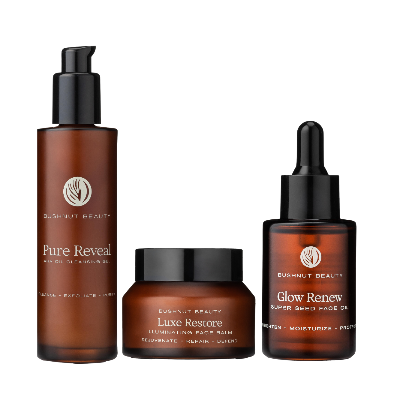 The ritual includes our entire eco-luxury skincare collection—Pure Reveal AHA Oil Cleansing Gel, Luxe Restore Illuminating Face Balm, and Glow Renew Super Seed Face Oil.